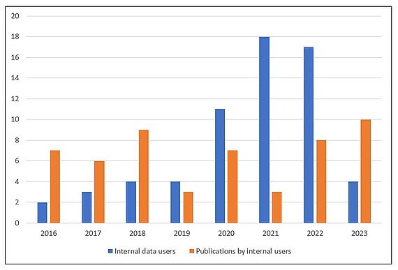 Between 2016 and 04/2023, a total of 63 internal users used TVSEP data for their research. Their publications amounted to 53 in the same period. The adjacent figure shows the development of the number of internal users and their publications. In addition, 17 dissertations were completed internally, and another 28 dissertations were completed prior to 2016.